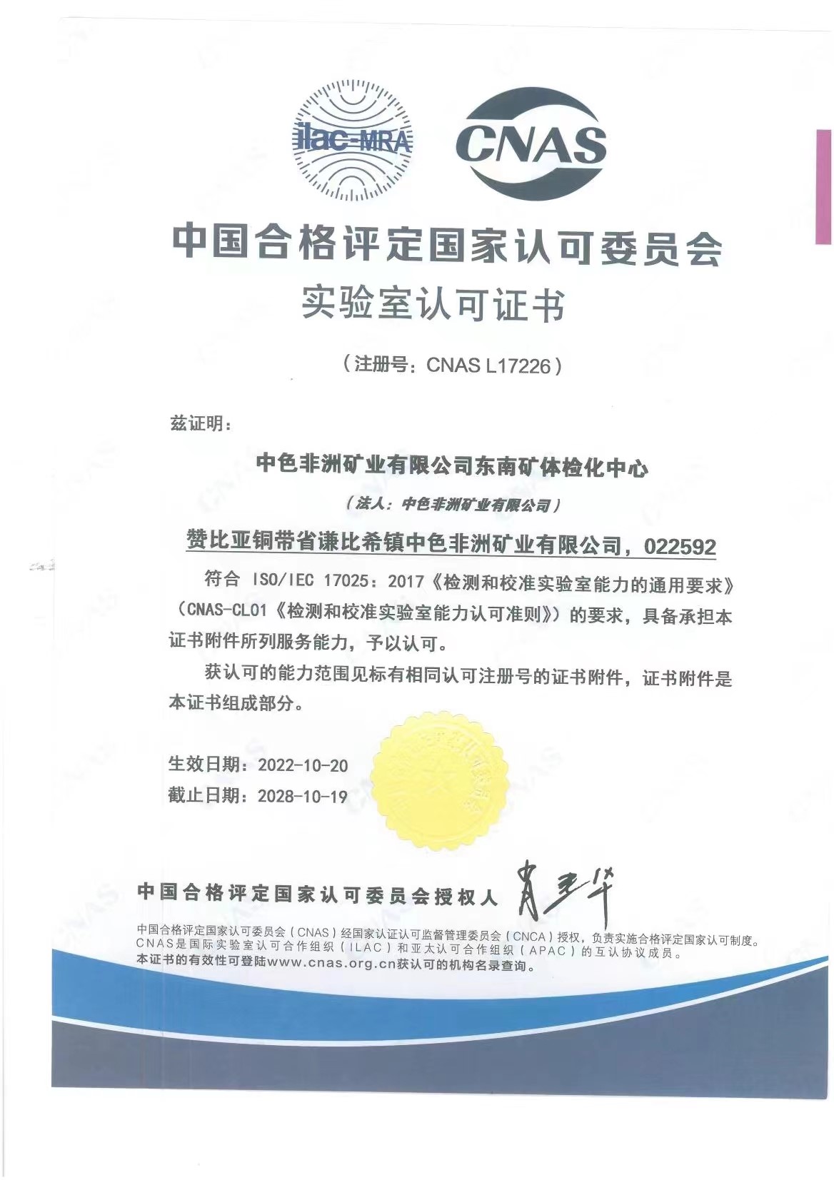 近日,中國有色集團(tuán)國際研發(fā)中心贊比亞實(shí)驗(yàn)室(簡稱:贊比亞實(shí)驗(yàn)室)通過中國合格評(píng)定國家認(rèn)可委員會(huì)評(píng)定,授予檢測(cè)實(shí)驗(yàn)室認(rèn)可資格和ILAC-MRA、CNAS聯(lián)合標(biāo)識(shí),標(biāo)志著贊比亞實(shí)驗(yàn)室在銅、鈷領(lǐng)域的檢測(cè)能力得到ILAC-MRA國際互認(rèn)、獲得國家CNAS權(quán)威認(rèn)可。