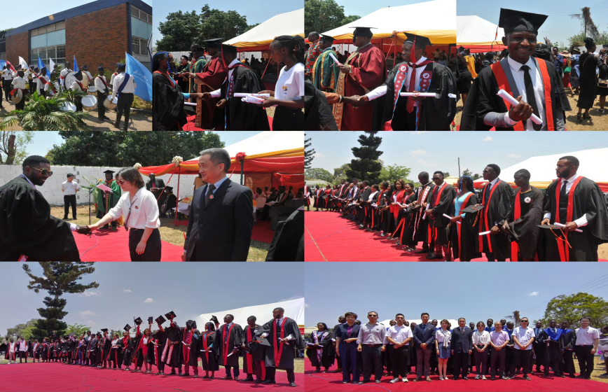 贊比亞當?shù)貢r間10月6日,中國-贊比亞職業(yè)技術(shù)學院(以下簡稱:中贊職院)首屆畢業(yè)典禮在贊比亞盧安夏隆重舉行。贊比亞科學技術(shù)部技術(shù)教育與培訓司司長Simumba Alex 、贊比亞職業(yè)技術(shù)教育管理局局長Cleophas Takaiza、贊比亞盧安夏地區(qū)專員 Oncemore Ngonomo、中國有色集團在贊比亞出資企業(yè)中色盧安夏總會計師余新亮、中色盧安夏贊方副總經(jīng)理Robert Kamanga蒞臨現(xiàn)場并致辭。中國教育部職業(yè)教育與成人教育司副司長林宇、北京工業(yè)職業(yè)技術(shù)學院等10所試點合作院校領(lǐng)導發(fā)表視頻致辭,各院校教師代表現(xiàn)場出席畢業(yè)典禮。