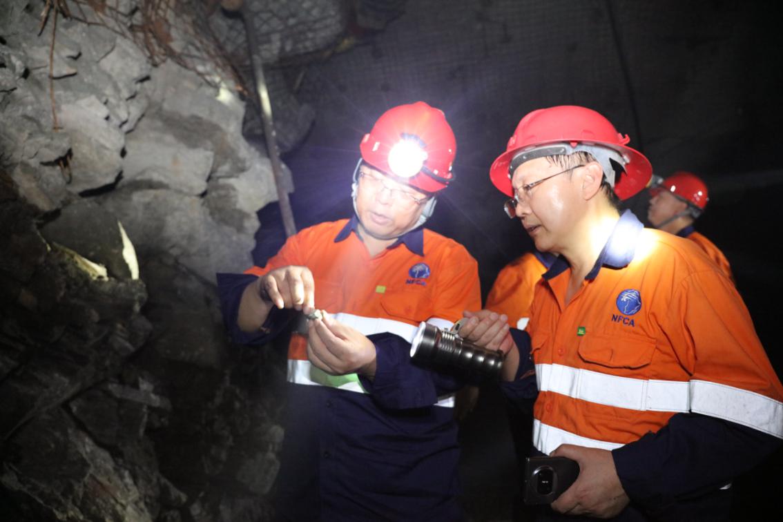 在中色非礦,奚正平董事長一行來到中色非礦主西礦體井下新盤區(qū)二盤區(qū)573mI采場、400mL主維修硐室,實地查看了采場支護、掘進通風、爆破作業(yè)、設備維保和文明生產等情況。隨后參觀了東南礦體控制中心、贊比亞實驗室、員工技能培訓學校,仔細詢問生產工藝流程、信息化建設、經濟技術指標、科研創(chuàng)新、安全警示教育等工作情況。