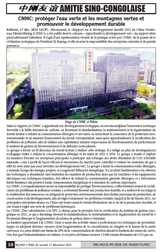 剛通社是中南部非洲最具權威主流媒體之一,創(chuàng)辦有《中剛友誼》專欄。這是在繼2021年5月五連載發(fā)布《中國有色集團剛果(金)可持續(xù)發(fā)展報告》之后,再一次全媒體集中宣傳推介中國有色集團,形成了良好的國際輿論環(huán)境。? ? ?
