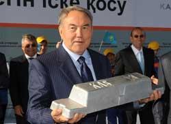 納扎爾巴耶夫總統(tǒng)手持電解鋁廠出產(chǎn)的鋁錠