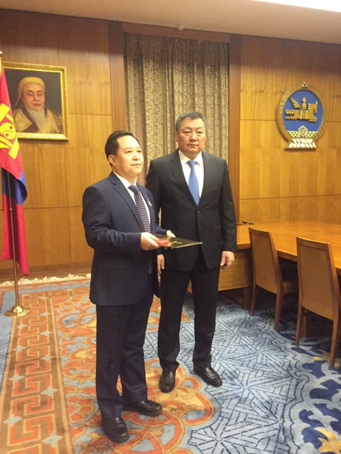 蒙古國總統(tǒng)辦公廳主任巴雅爾賽汗代表額勒貝格道爾吉總統(tǒng)向王宏前總經(jīng)理頒發(fā)榮譽獎章