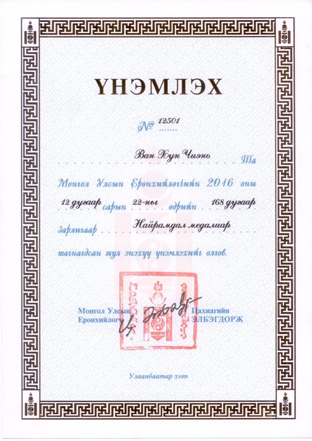 2016年12月25日,中色股份王宏前總經(jīng)理在蒙古國國家宮接受由蒙古國總統(tǒng)辦公廳主任巴雅爾賽汗根據(jù)總統(tǒng)令代表總統(tǒng)額勒貝格道爾吉頒發(fā)的“友誼獎章”,這是蒙古國授予外國公民的最高榮譽。