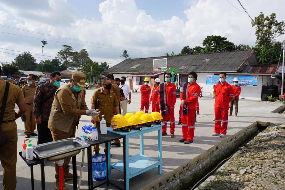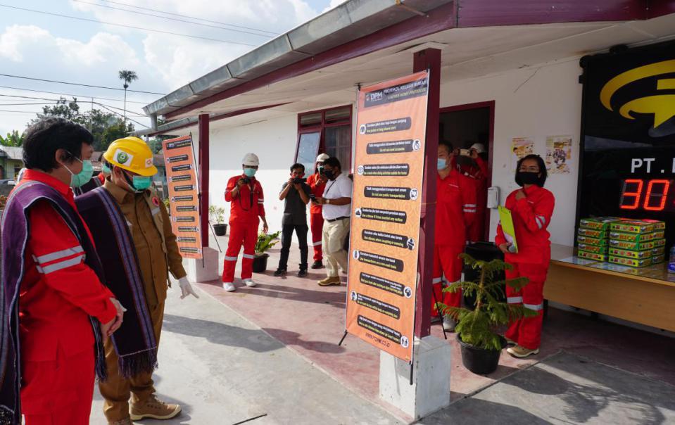 縣長Eddy一行首先在達瑞礦業(yè)公司馬金平董事長的引導下,檢查了辦公區(qū)出入口、辦公室、會議室及隔離房間等的防疫設(shè)施情況,雙方就防疫措施細節(jié)交換了意見。隨后,所有人員在室外觀摩了達瑞礦業(yè)發(fā)現(xiàn)疑似病例應(yīng)急處置演練,此次演練全流程、全配套模擬了從發(fā)現(xiàn)并報告疑似病人,到由穿戴全套防護裝置的人員將疑似病人護送上救護車,再由專業(yè)護士的陪同下送往當?shù)蒯t(yī)院,對相關(guān)密切接觸者進行排查,對疑似病例宿舍進行消毒的各個流程環(huán)節(jié)。為了加強印尼方員工的防控意識,本次演練由達瑞礦業(yè)公司疫情防控小組指導,全程由印尼本地員工參與執(zhí)行。
