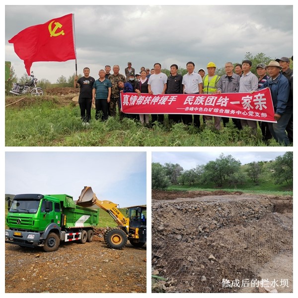 白音勿拉鎮(zhèn)乃力珠嘎查每到夏季,總會受到山洪的侵襲,農(nóng)田和草場損毀,經(jīng)濟(jì)遭受損失。白礦黨委了解到情況后,想政府之所想,急牧民之所急,經(jīng)研究,決定為乃力珠嘎查修建攔水壩。6月25日清早,白礦黨委派出人員和車輛到乃力珠嘎查施工。在當(dāng)?shù)啬撩竦呐浜舷?,?jīng)過6天的艱苦奮戰(zhàn),6月30日,三座攔水壩順利完工,共用石塊、渣石料等160 余車。
