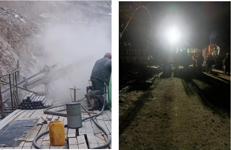 圖1:霜雪裝飾下的施工現(xiàn)場如火如荼 圖二:寒夜里施工現(xiàn)場燈火通明 邊坡治理團隊領命以后,施工單位即刻展開冬季施工準備工作:采購冬季勞保用品、混凝土保溫棉被、混凝土伴熱帶等冬季施工材料;研究冬季施工措施,搭建注漿棚屋、自制土法水鍋爐、炒砂盤、混凝土移動保溫料斗、制作混凝土攪拌用水加熱桶、保溫充填管;延長作業(yè)時間,要求錨索加工和錨索孔鉆進施工早7點到晚7點,注漿施工不分晝夜。鑫都管理人員堅守現(xiàn)場,指導和監(jiān)督錨索制作、錨索孔定位與鉆進、錨索安裝、注漿指導等工作,協(xié)調露天采剝生產與邊坡治理,全力以赴保障邊坡治理各項工作順利開展。棉帽霜凍成雪,睫毛掛上冰串,宛然工地上的“北極人”;手腕凍得紅腫不叫苦,口罩結冰無法呼吸,摔打下冰片繼續(xù)加油干。