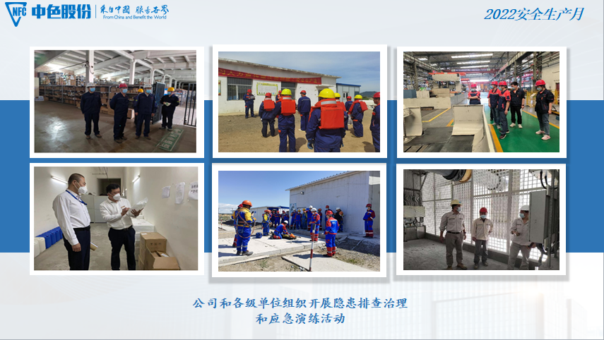 今年6月是第21個全國“安全生產(chǎn)月”。為深入貫徹落實習(xí)近平總書記關(guān)于安全生產(chǎn)重要論述,扎實推進安全生產(chǎn)專項整治三年行動鞏固提升,引導(dǎo)公司全體員工強化安全發(fā)展理念,壓實安全責(zé)任,防控安全風(fēng)險,提升安全素養(yǎng),中色股份本部、各項目部和出資企業(yè)緊緊圍繞“遵守安全生產(chǎn)法當(dāng)好第一責(zé)任人”主題,在常態(tài)化疫情防控的背景下,開展了內(nèi)容豐富、形式多樣的宣傳教育活動,取得了預(yù)期的成效。