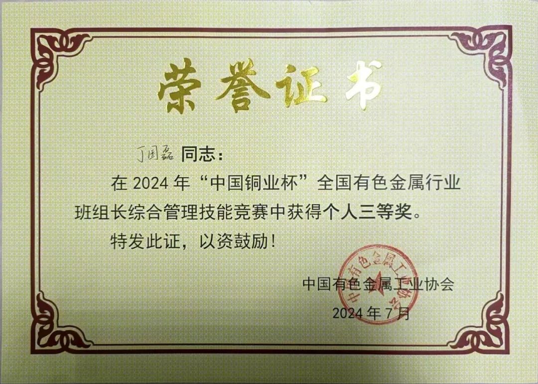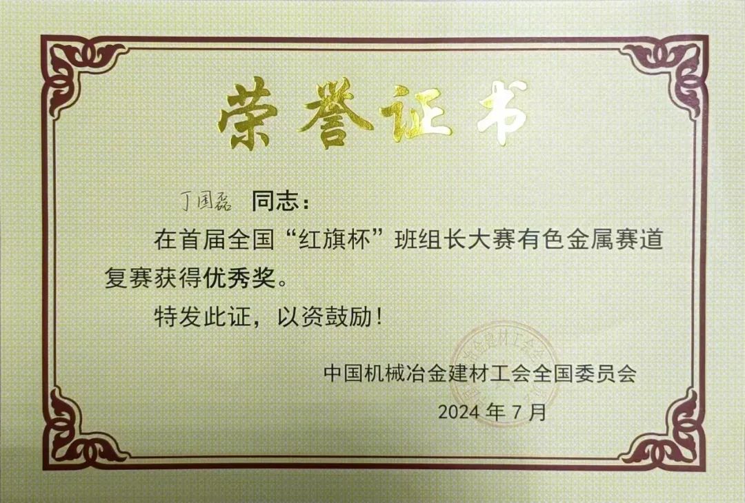 近日,首屆全國“紅旗杯”班組長大賽有色金屬賽道復(fù)賽暨2024年“中國銅業(yè)杯”全國有色金屬行業(yè)班組長綜合管理技能競賽圓滿落幕,中色東方職工丁國磊榮獲“紅旗杯”優(yōu)秀獎,并在“中國銅業(yè)杯”競賽中,榮獲三等獎。