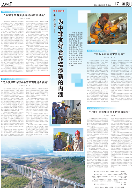 2022年2月15日出版的《人民日?qǐng)?bào)》刊發(fā)題為《中非職業(yè)教育——為中非友好合作增添新的內(nèi)涵(大道不孤)》文章,對(duì)中國(guó)有色集團(tuán)推動(dòng)我國(guó)職業(yè)教育“走出去”情況進(jìn)行了報(bào)道(鏈接:http://paper.people.com.cn/rmrb/html/2022-02/15/nw.D110000renmrb_20220215_1-17.htm)。以下為報(bào)道全文:
