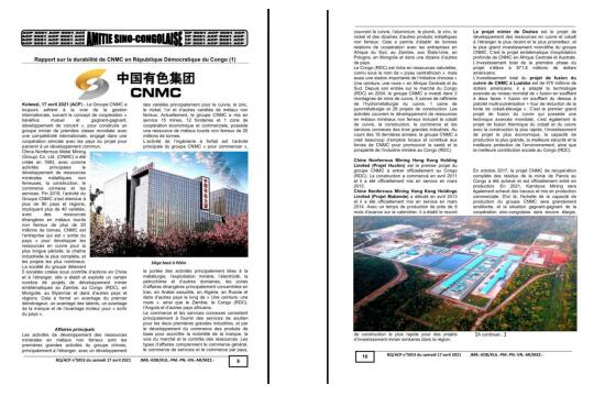2021年4月17日至5月7日,剛果國家通訊社在其紙質(zhì)日報《中剛友誼》專欄上發(fā)布中國有色集團剛果(金)可持續(xù)發(fā)展報告,并在其官方網(wǎng)站、推特及臉書平臺上進行同步轉(zhuǎn)發(fā),覆蓋粉絲近百萬,矩陣傳播效果明顯。