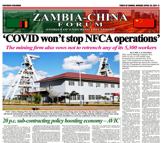 4月26日,贊比亞影響力最大的主流媒體贊比亞時(shí)報(bào)在“贊中友誼論壇”頭條位置,再次講述了中國有色集團(tuán)出資企業(yè)中色非洲礦業(yè)公司(簡稱:中色非礦)故事——“疫情下,中色非礦不會裁減任何一個(gè)贊比亞員工”。同期財(cái)稅專版,還刊載了中色非礦自成立以來累計(jì)繳納稅收達(dá)2億美元,用行動踐行“中贊合作、共同發(fā)展”理念,積極支持贊比亞經(jīng)濟(jì)發(fā)展的專題報(bào)道。