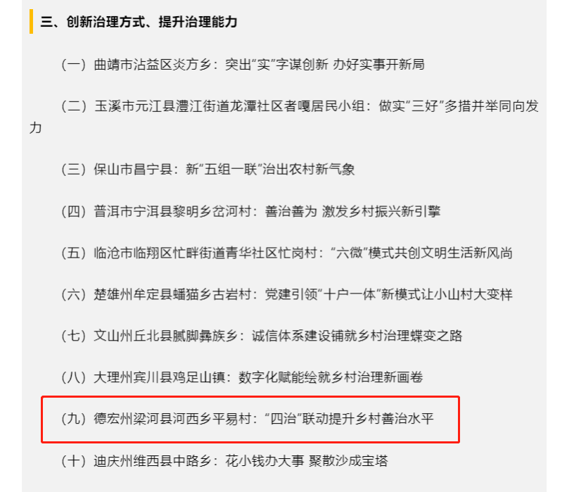 近年來,平易村積極貫徹黨中央、國務(wù)院以及云南省省委、省政府的決策部署,在梁河縣和中國有色集團(tuán)的指導(dǎo)下,努力加強(qiáng)和改進(jìn)鄉(xiāng)村治理工作,現(xiàn)出了一批好的經(jīng)驗(yàn)和做法。平易村黨總支與中國有色集團(tuán)2個(gè)支部積極開展黨建共建,堅(jiān)持黨建引領(lǐng),以農(nóng)民自治為基礎(chǔ),以“支部領(lǐng)治、群眾自治、群團(tuán)協(xié)治、政企參治”四治工作法為指導(dǎo),注重群團(tuán)協(xié)作和政企參治,不斷推動(dòng)協(xié)作聯(lián)動(dòng)、齊抓共治的鄉(xiāng)村治理新格局的建設(shè),創(chuàng)新治理方式,提升治理能力,促進(jìn)鄉(xiāng)村治理體系建設(shè)和發(fā)展,得到了云南省農(nóng)業(yè)農(nóng)村廳的高度認(rèn)可,被推介為全省鄉(xiāng)村治理的典型案例。