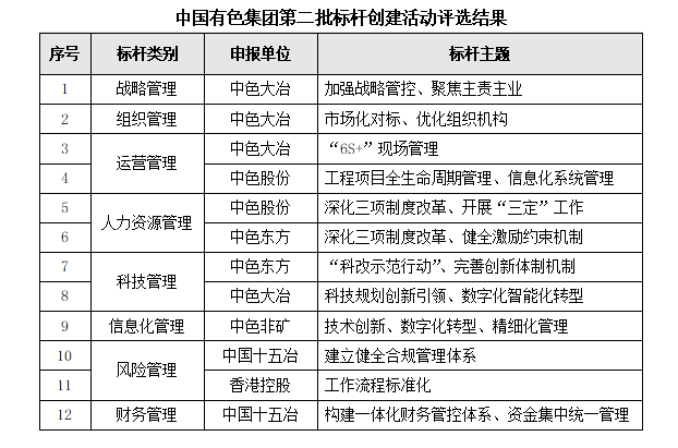 為進一步貫徹落實國企改革三年行動部署要求,指導推動出資企業(yè)鞏固提升改革成效,中國有色集團對照國資委對標世界一流管理提升行動要求,組織開展了第二批管理提升典型標桿創(chuàng)建活動,圍繞戰(zhàn)略管理、組織管理、運營管理、人力資源管理、科技管理、信息化管理、風險管理、財務管理八個方面評選12項典型標桿,并予發(fā)布。