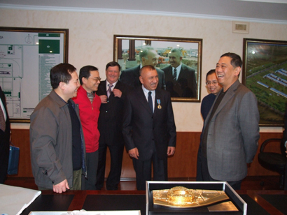 為祝賀哈鋁項(xiàng)目一期的勝利投產(chǎn),并感謝哈鋁公司對中色股份的信任,羅濤董事長還向伊博拉吉莫夫總裁贈(zèng)送了08奧運(yùn)場館鳥巢的鍍金模型。伊博拉吉莫夫總裁高興的接受了禮物,并向羅濤董事長表示,雙方的合作將象金子一樣的閃亮和輝煌。